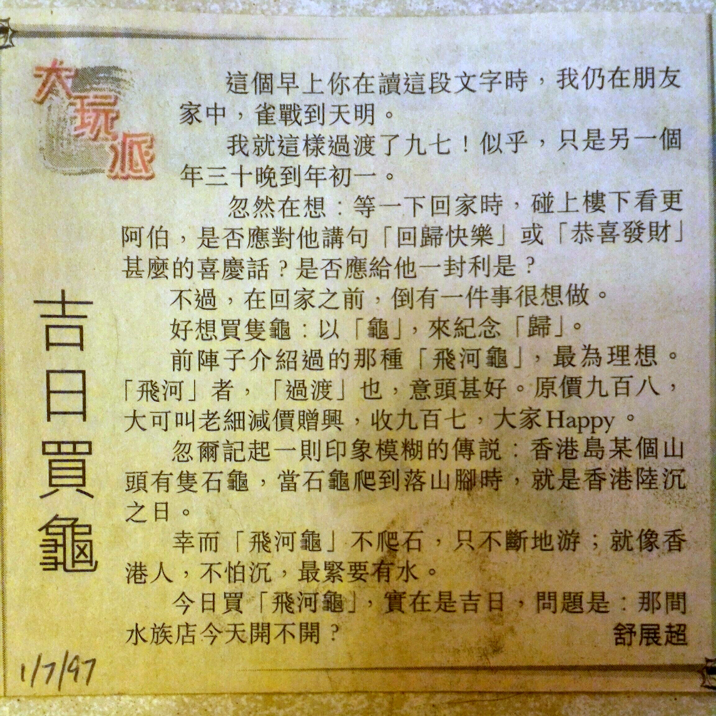 很記得,1997年6月30日的晚上,我在港島一位朋友的家中,與幾位中小學同學打通宵麻將,作為大家一起慶祝香港回歸的節目。